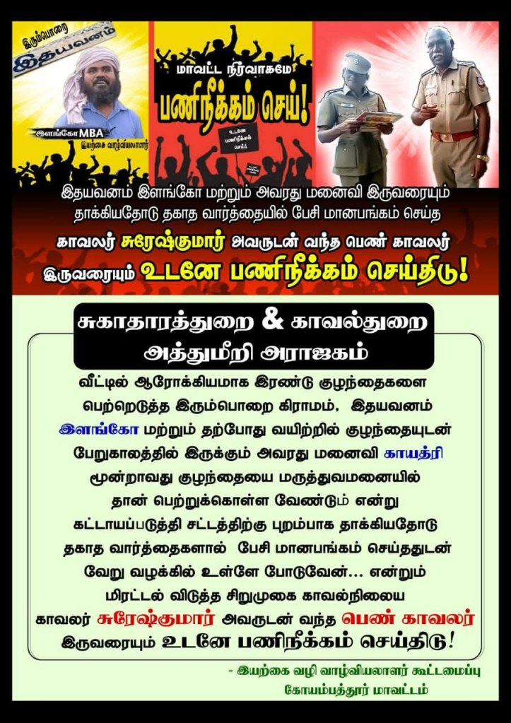 மேலும், சட்டத்திற்கு புறம்பாக தாக்கி, தகாத வார்த்தைகளால் பேசி மானபங்கம் செய்ததுடன், ”வேறு வழக்கில் உள்ளே போடுவேன்” என்று சிறுமுகை காவல்நிலைய காவலர் சுரேஷ்குமார் மற்றும் அவருடன் வந்த பெண் காவலர் இருவரும் இதயவனம் இளங்கோ மற்றும் அவரது மனைவி காயத்ரிக்கு மிரட்டல் விடுத்துள்ளனர். இச்செய்தியை சமூக ஊடகங்கள் வாயிலாக கோயம்புத்தூர் மாவட்ட இயற்கைவழி வாழ்வியலாளர் கூட்டமைப்பு வெளியிட்ட மின்னணு சுவரொட்டி மூலமாக அறிந்து கொண்டோம்.