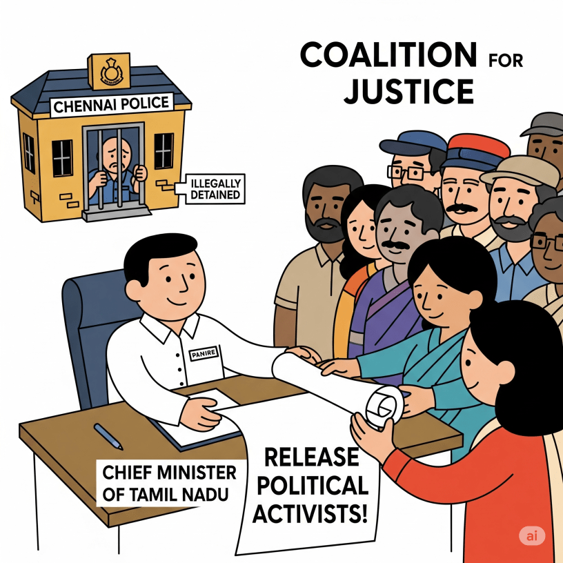 தூய்மைப் பணியாளர்கள் போராட்டத்தில் கைது செய்யப்பட்டவர்களை விடுவிக்கக் கோரி முதலமைச்சருக்கு நீதிக்கான கூட்டியக்கம் மனு அனுப்பியுள்ளது.